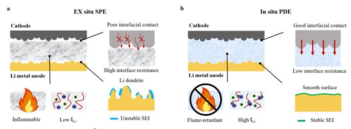 经过数十年的发展,根据组成成分的不同固态电解质可以分为无机固态电解质和聚合物固态电解质两大类。与无机固态电解质相比,聚合物固态电解质拥有良好的柔性和可塑性,易加工成各种形状,而且价格相对低廉,更适合大规模生产,因此具有广阔的应用前景。然而聚合物电解质与电极(尤其是正极)的界面接触差、界面电阻高、安全性差等问题限制了其进一步的发展。针对这些问题,该工作以三(五氟苯基)硼烷(TPFPB)作为引发剂,以原位聚合的方法来制备DOL基的聚合物电解质。同时,具有高氟含量的TPFPB受热分解产生的氟自由基还可以通过捕获H⋅和OH⋅等高活性的自由基,提升聚合物电解质的阻燃性能,以解决聚合物电解质易燃、安全性差的问题。而且TPFPB在正极侧分解后,有利于形成富含氟化锂的稳定CEI膜,提升该电解质的高电压耐受能力,有效拓宽电解质的稳定电化学窗口,使其可以匹配高电压正极材料。当该电解质与金属锂负极和硫正极、磷酸铁锂正极以及高电压三元正极匹配成全电池并对其进行电化学性能测试,实验结果表明三种电池都具有优异的电化学性能。