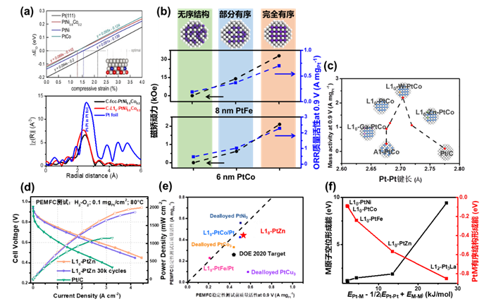 图2. 5 nm L10-PtNi0.8Co0.2催化剂:(a)Pt-O最优吸附能ΔEO与表面Pt应力的关系和Pt L3同步辐射EXAFS谱图;(b)L10结构有序度-磁矫顽力-ORR性能关系图; (c)W掺杂L10-PtCo催化剂不同结构Pt-Pt键长和ORR质量活性关系图;(d-e)3 nm L10-PtZn催化剂PEMFC性能测试;(f)L10-PtM合金键能与形成能/M空位形成能的关联。