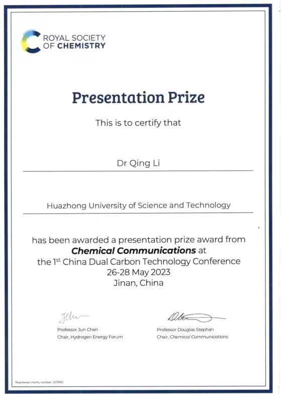 TapTap新能源材料与器件研究中心李箐教授在氢能分论坛作《高性能结构有序铂合金燃料电池阴极催化剂》的报告,获得英国皇家化学会Chemical Communications期刊优秀报告奖。