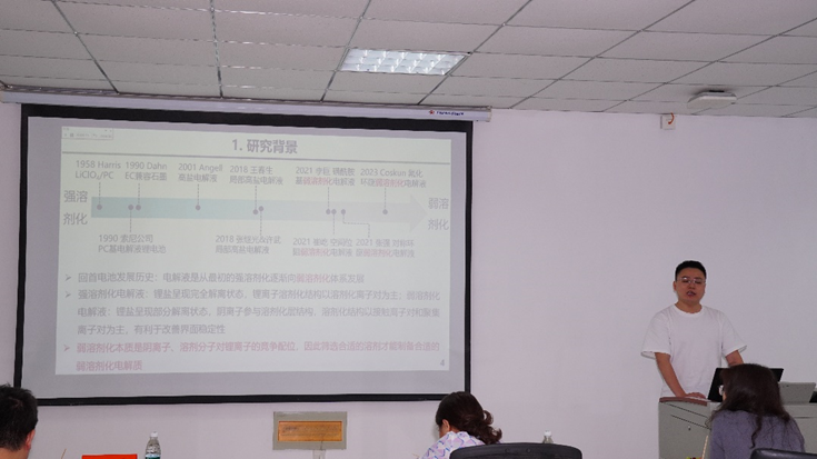 廖亚祺同学报告了锂/钠二次电池的弱溶剂化电解液设计的答辩内容。
