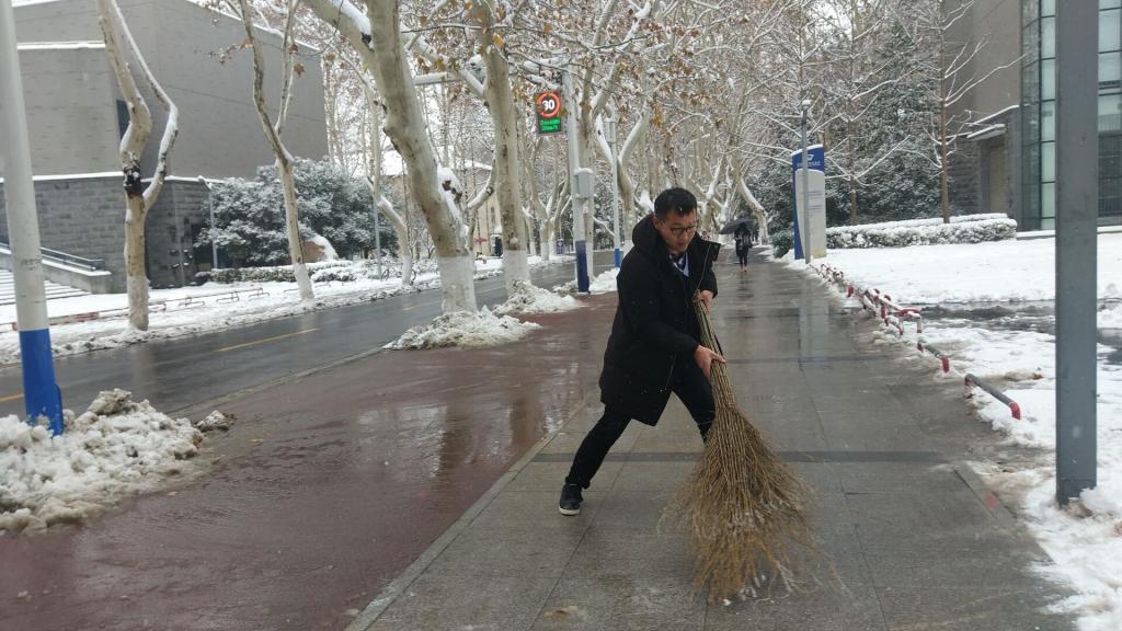 参加除雪活动的研究生全然不顾漫天的大雪淋湿了头发和鞋子,积极配合,干劲十足。先用铁锹破冰,再用铁锹将碎冰、积雪铲起堆积在一起,最后再用扫把将路面上残余的冰雪清理干净,干得热火朝天。虽然天气严寒,但不少同学在除雪过程中都累出了汗。