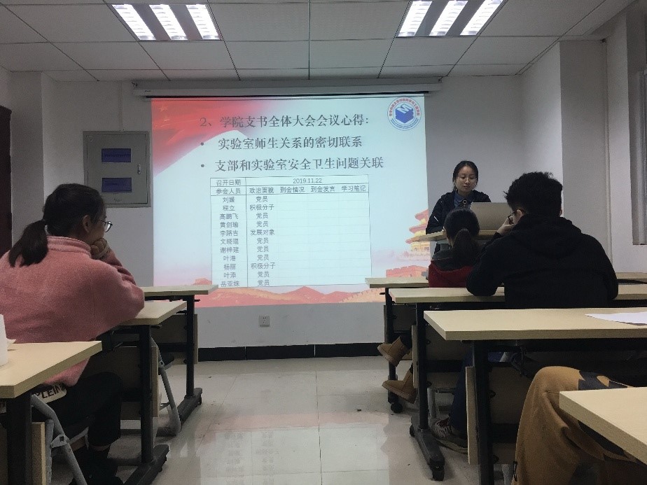 随后,党支书刘媛同志与全体党员分享TapTap刚开展的全体党支书大会的心得体会,提出我们要保持实验室师生关系的密切联系,支部党员要起到先锋模范带头作用,积极主动负责实验室安全卫生问题,发挥身先士卒、为人民服务的精神。叶添同志在会议期间说到,强化组织监督和民主监督,发挥同级相互监督作用,可落实到我们实验室的安全卫生问题,只有大家相互监督,实验室的安全卫生才会更好! 最后刘媛同志通知全体党员交纳十一月党费,刚加入支部的新生党员补交7月至9月的党费,并按时交学习笔记。