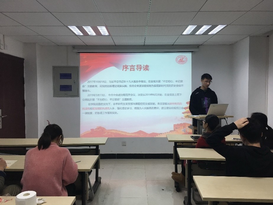 (通讯员 刘媛)2019年11月22日晚上七点,材料加工研究生第十五党支部在焊接楼304会议室开展“不忘初心、牢记使命——加强支部凝聚力,强化支部战斗堡垒作用”主题学习活动。会议由党支书2018级硕士刘媛主持,新生党员2019级硕士叶港主讲,全体党员、发展对象和入党积极分子都参加本次会议。