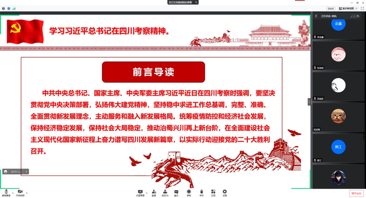 5月27日下午,中共中央政治局就深化中华文明探源工程进行第三十九次集体学习。习近平总书记在主持学习时强调,中华文明源远流长、博大精深,是中华民族独特的精神标识,是当代中国文化的根基,是维系全世界华人的精神纽带,也是中国文化创新的宝藏。6月8日,习近平先后来到眉山、宜宾等地,深入农村、文物保护单位、公司、企业等进行调研。在本月主题党日学习中,各研究生党支部围绕文化自信、总书记在四川调研时的讲话以及观看学习军事纪录片展开。