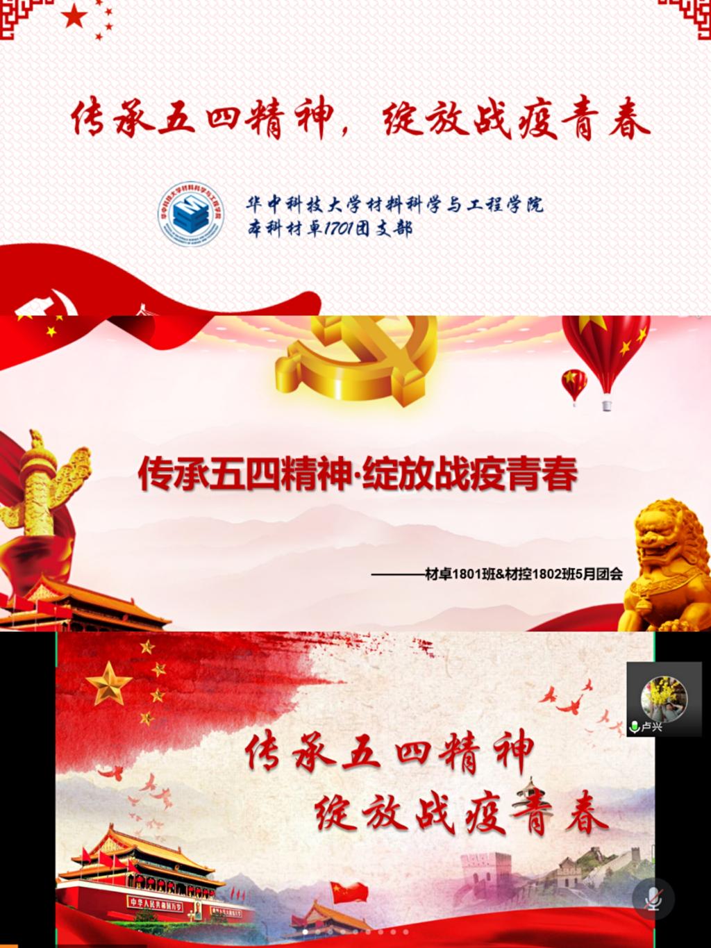 5月22日,副经理卢兴参加了材料1911班团支部的线上主题团会。团会上全体同学一起学习了习近平总书记5月3日给全国各族青年的重要寄语精神、观看了视频《后浪》传达出对青年一代的勉励与希冀。团会最后,卢兴老师结合自己在疫情期间参加抗疫志愿服务的经历,勉励同学们牢记使命、奋发图强,拿出实干激情,在时代的浪潮中,绽放出自己的色彩,为祖国保驾护航。