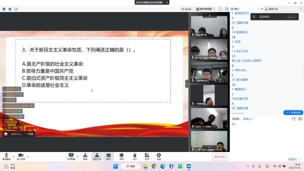 本次活动由研工组主办,11月7日开始报名,最终共有34支队伍参与活动,于11月14日举办线上初赛,14支队伍脱颖而出进入复赛,11月24日晚以腾讯会议方式举办复赛,最终有13支队伍参赛,研工组组长王曦老师,学工组黄娟老师出席当晚活动。复赛分为必答题—同舟共济,抢答题—分秒必争,《这十年•向未来》纪录片学习三个环节。