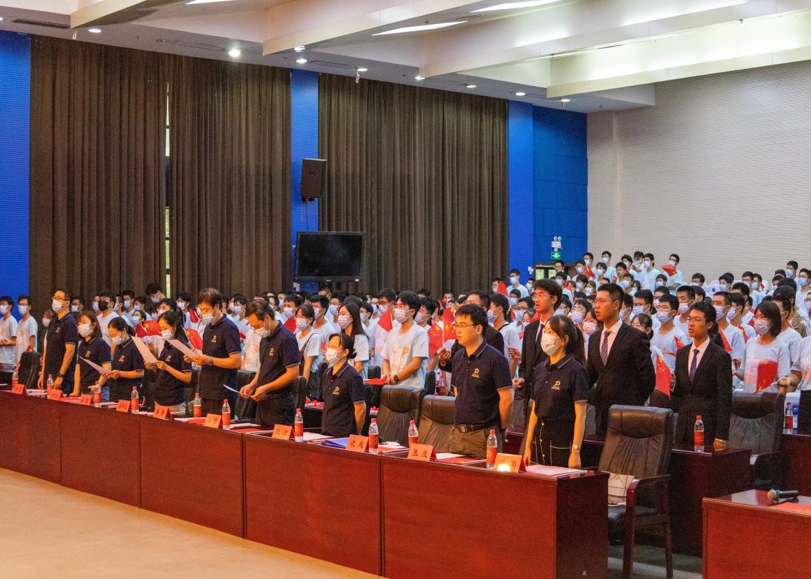 典礼在庄严的国歌声中拉开序幕。随后,副经理樊自田宣读聘任教师班主任决定,院领导为2022级全体教师班主任颁发聘书,经理周华民为2022级各班授予班旗。