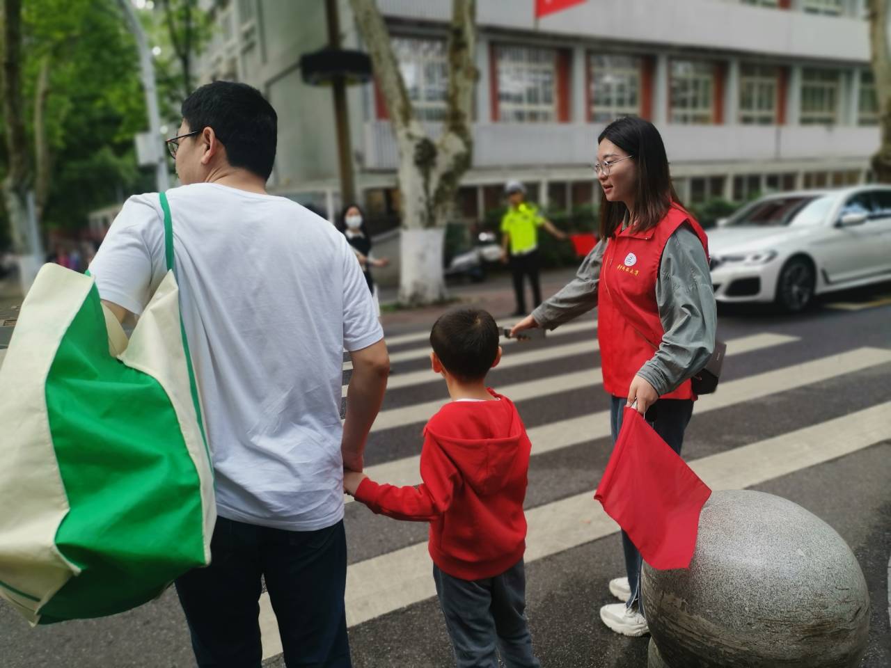 青,是自然的绿色,是生命的颜色;春,是生长的季节,是成长的时节。青春就是在大自然时节里那片生命的绿色,是阳光下那片最灿烂的笑容。在充满春天气息的绿色校园中,为维护出行秩序,支部成员时恬、徐佳辉、唐天宇同志自发报名参与“益路华中大”志愿活动。他们顶着烈日,脸上带着微笑,手中执着旗,协助交警为行人指引方向。他们坚守于斑马线,守护这个校园的平安,晨起的“街头守望者”,以奉献为美,以值岗为荣,以实际行动传播爱贡献力量。他们的出现进一步提升各路口的通行效率和安全,提高员工们的遵法守规自觉性。
