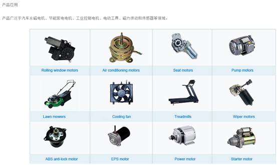 公司产品涵盖高档永磁铁氧体电机瓦磁、扬声器环磁、稀土永磁等多个门类,应用领域涉及汽车、节能家电、工业电机、电声、医疗、计算机、通讯以及航空航天等;产品品质广受客户信赖和赞誉,远销欧、美、亚三十多个国家和地区,是国内领先的综合磁材产品生产经营企业。