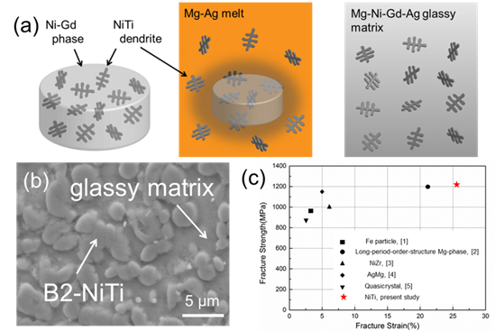 成果简介:利用预制合金(Ni-Ti-Gd)浸润在Mg熔体中时,Ni-Gd相选择性溶解在熔体中,而Ni-Ti相稳定存在的现象(如图(a)所示),制备了新型原位自生形状记忆相(B2-NiTi)增强镁基复合材料(如图(b)所示),复合材料的强度及塑性优于至今利用其它手段制备出的原位自生镁基非晶复合材料。