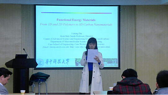 2014年12月15日上午,戴黎明教授在先进制造大楼西楼A308学术报告厅作了题为“Functional Energy Materials: From 1D and 2D Polymers to 3D Carbon Nanomaterials”的学术报告。徐鸣教授组织并主持了本次报告会。徐鸣教授首先对戴教授的来访表示了诚挚的感谢,随后介绍了戴教授的履历及主要学术成就。在报告会上戴教授总结了多维共轭聚合物和碳纳米材料用于能源转换及储能所存在的一些结构设计问题以及最新发展;此外还介绍并预测了非金属催化剂的光明前景以及碳管超强干胶的潜在广泛用途。戴教授的报告内容详实,讲解过程明晰缜密,凭借丰富的研究经验和超前的锐利眼光指出了现今该领域所存在的一些疑难点并展望了能源转化及储能材料的未来。在随后的提问环节中,戴教授深入浅出的分析和解答了问题。最后,戴教授鼓励与会的研究生要认真努力地进行科研工作。