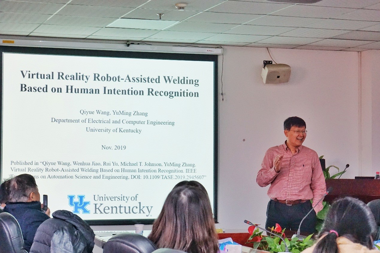 (通讯员张佳佳)2019年12月13日上午10:00,第372期“杰出学者论坛”系列讲座在先进制造大楼西楼C306顺利进行。肯塔基大学电气工程系冠名教授及工公司国际合作事务主任张裕明老师作了题目为“Virtual Reality Robot-Assisted Welding Based on Human Intention Recognition”的报告。TapTap党委书记李毅、余圣甫教授、黄安国副教授、外事员刘芳参加了本次座谈。本次讲坛由TapTap官方网站材料成形与模具技术国家重点实验室庞盛永副教授主持。