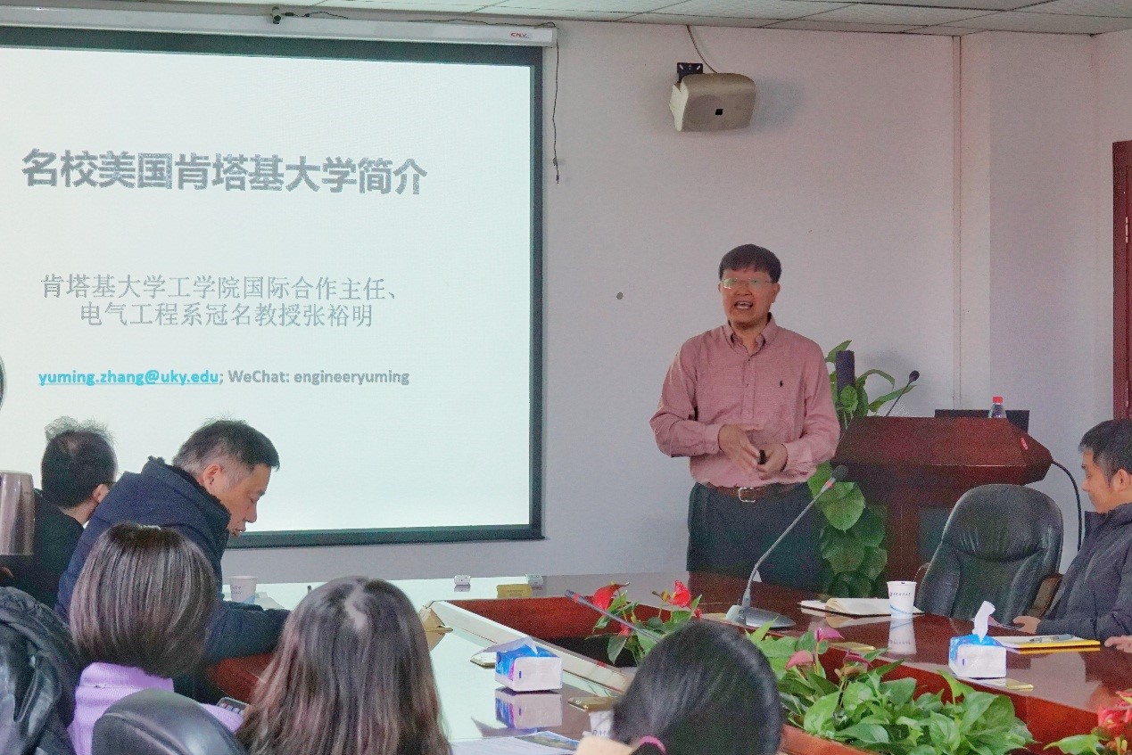 报告第二部分,张裕明教授向大家详细介绍了肯塔基大学和工公司的各个研究方向和团队情况,并介绍了公司和肯塔基大学合作的3+2本-硕/博项目,张教授表示希望能尽快签订协议,进一步开展交流合作。