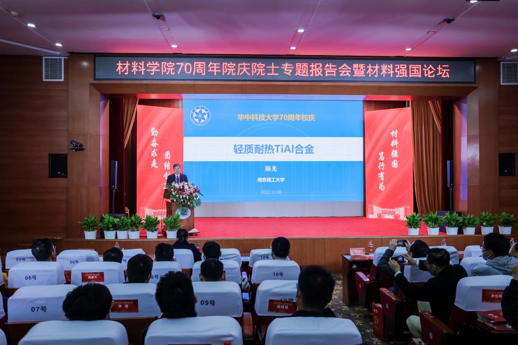 陈光院士作《轻质耐热TiAI合金》主题报告。他表示,入学公司时“今天我以华工为自豪,明天华工以我为骄傲”的横幅给他留下深刻印象,本次报告是回到母校的一次汇报。他首先介绍了自己的工作单位——南京理工大学的发展历史,并回顾了自己的求学之路。