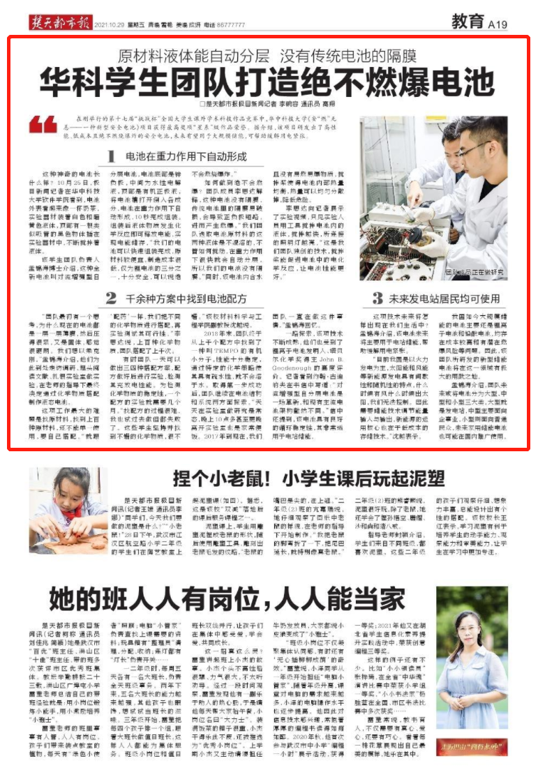 2021年10月29日,楚天都市报以《原材料液体能自动分层,没有传统电池的隔膜,华科员工团队打造绝不燃爆电池》为题,报道了公司员工团队的《安“燃”无恙——一种新型安全电池》项目。在刚举行的第十七届“挑战杯”全国老员工课外学术科技作品竞赛中,公司该项目获得最高奖项“星系”级作品荣誉。