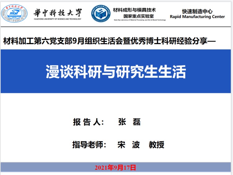 材料加工第二党支部赵明杰同志就如何开展研究、如何写好一篇论文、如何投稿以及常用科研工具与测试方法四个方面进行了分享,内容详实,为新生们更好地融入科研生活起到了良好的引领作用。