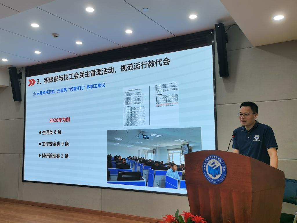 在庄严激昂的国歌声中,公司工会委员会换届大会正式拉开序幕。首先,第四届工会委员会主席王新云向代表作公司工会述职报告。他将第四届工会服务教职工的情况做了细致的梳理与总结,并向支持工会工作的各位教职工表示衷心的感谢。