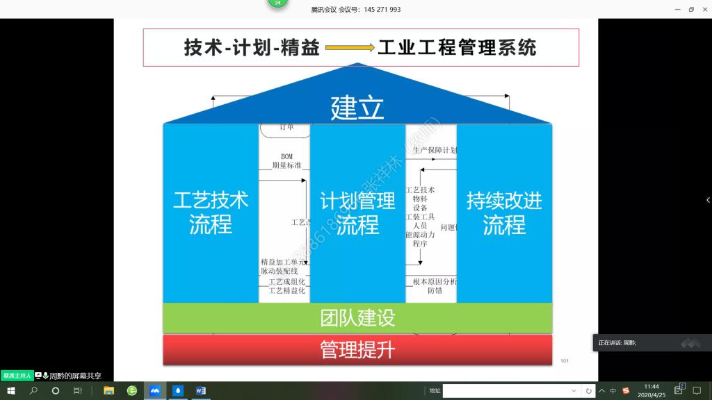 网络课堂上,周黔不断结合自身从业30多年的工作经历和工业工程实践,娓娓道来。U型产线改造、工业工程系统三根柱子等自身实践,给同学们留下的深刻印象。在讲课过程中,他展现出对自己所从事国防事业的热情和自豪感,感染着、触动着每一位同学。