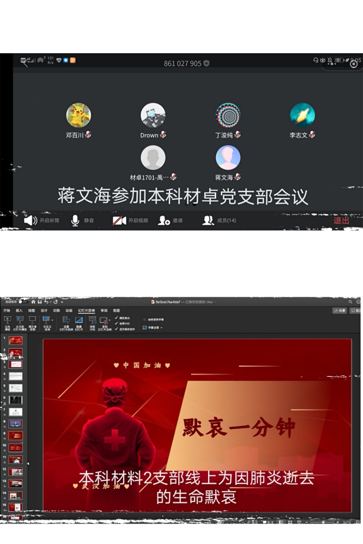 ——晚上8点30分,蒋文海老师准时上线,参与所在本科材卓党支部召开的“坚定信心,众志成城,共克‘疫’艰”专题组织生活会。2月15日至20日,学工组所有辅导员均下沉到员工党支部,参加员工支部组织生活会,了解同学们在疫情期间思想动态,引导同学们在疫情期间更要坚定信心,坚定信仰,勇担时代责任和使命,以一世之学济一世之治。
