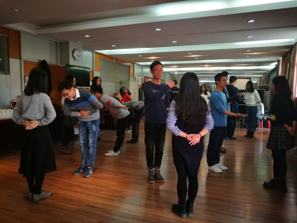 活动在王曦老师进行简短的开场介绍后开始。郭老师首先带领大家在优美抒情的音乐声中用手中的“沙蛋”敲打节拍,现场的气氛顿时活跃起来。紧接着,郭老师和她的助理开始耐心细致地教授同学们华尔兹舞蹈动作,让大家感受华尔兹集体舞式,在舞蹈世界中放松心情,释放内心压力。