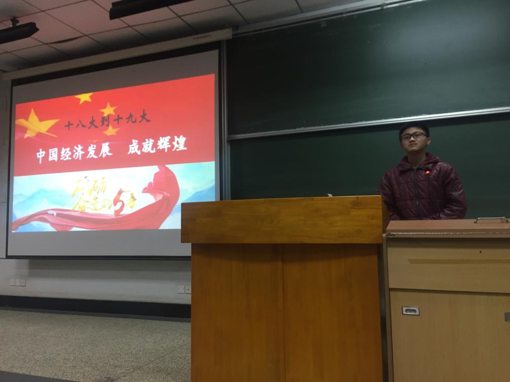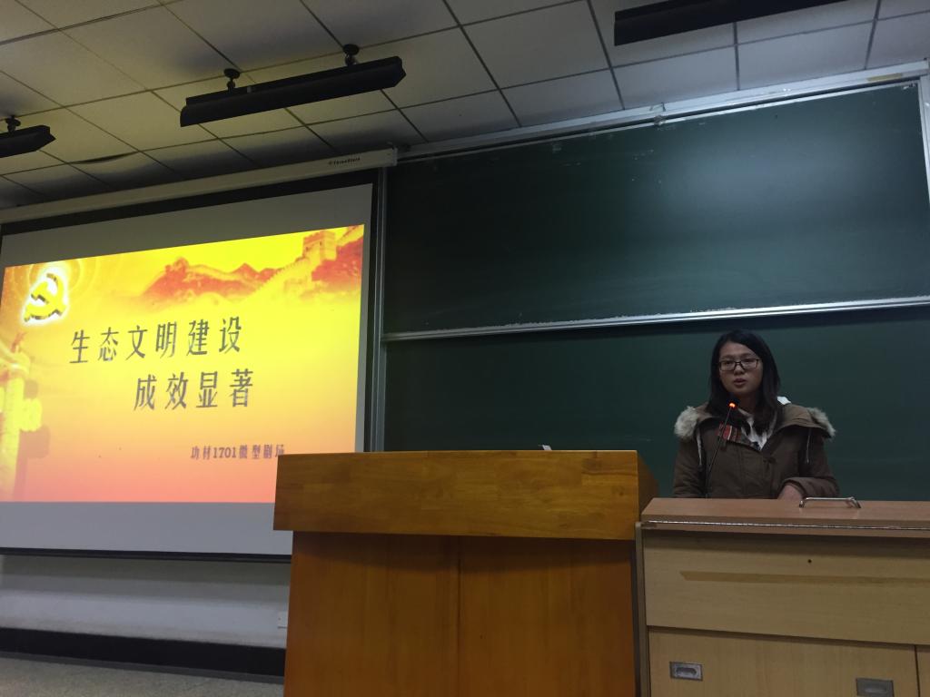 接下来,2017级本科团支部向我们展示了自己对十九大的理解。功材1702团支部书记梁超凡从GDP、就业率、人均国民收入等方面入手,用大量的数据展现了中国近年来的发展。电封1701团支部的同学以相声的形式向我们展示了他们对五年来中国特色法治体系的日益完善,功材1701团支部的同学们则用话剧的形式展示了生态文明建设的显著成效,为严肃的团课增添了一份乐趣。