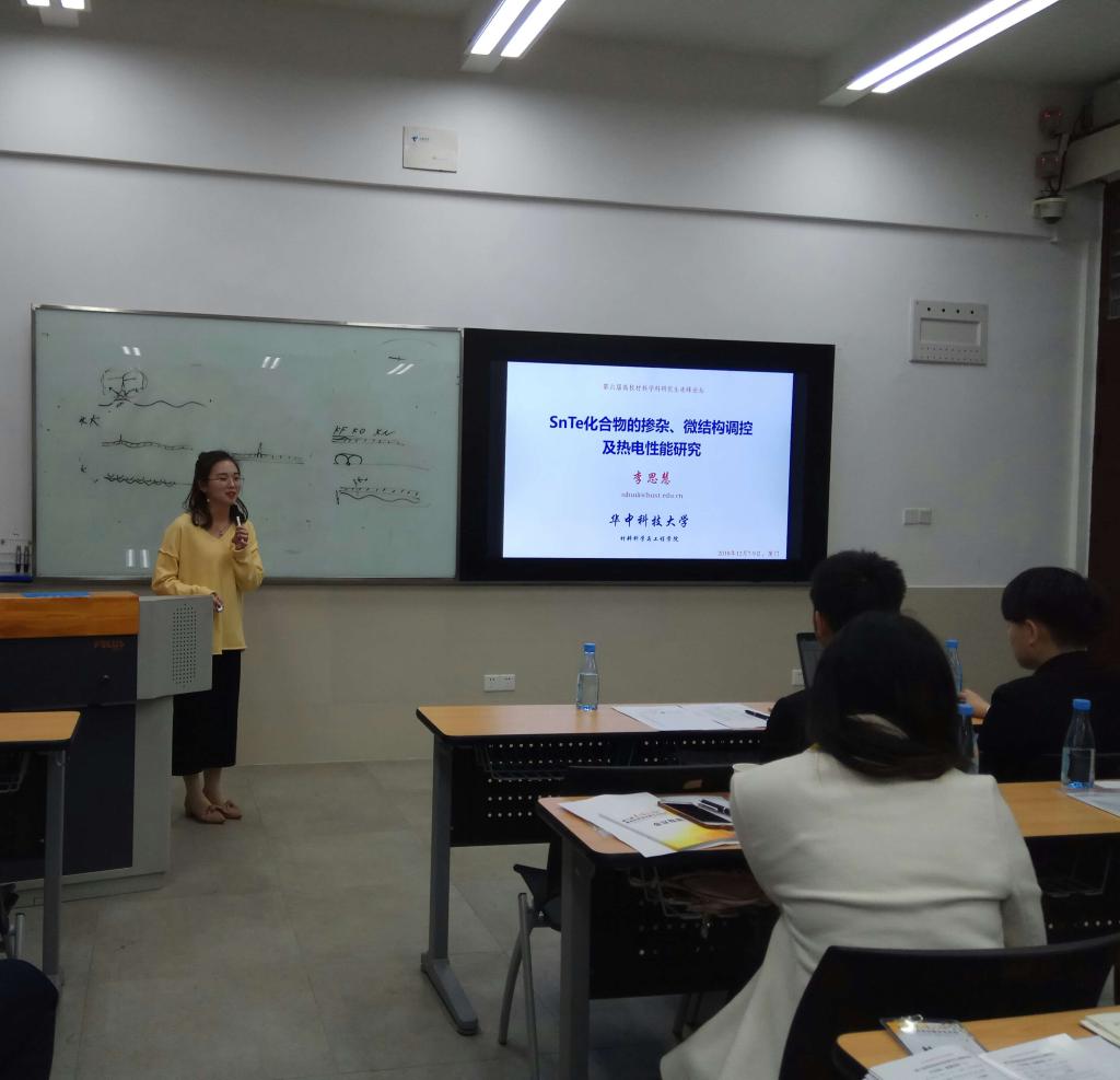 李思慧博士在导师杨君友教授的指导下,以“SnTe化合物的掺杂、微结构调控及热电性能研究”为题参与“能源材料”分论坛会议。其报告紧扣“节能”与“环保”这两条科研热点主线,基于热电材料可实现电能和热能之间直接转换的关键优势,重点介绍了通过纳米化复合以及阴阳离子共掺杂等方法进而实现了SnTe体系热电性能的大幅提升的研究成果。该研究为制备一种性能优异且相对环保的热电材料奠定了理论基础,得到了与会同仁的热切关注和讨论。