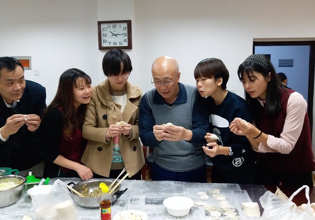 其中“实习队”由李德群院士带领,李建军、周华民、袁新华等组成,大家争先恐后,相互学习,快速进入洗菜、和面、擀皮、调馅的状态。不到一小时,一盘盘大小均匀、馅料饱满的饺子出锅,立即被大家一抢而光。