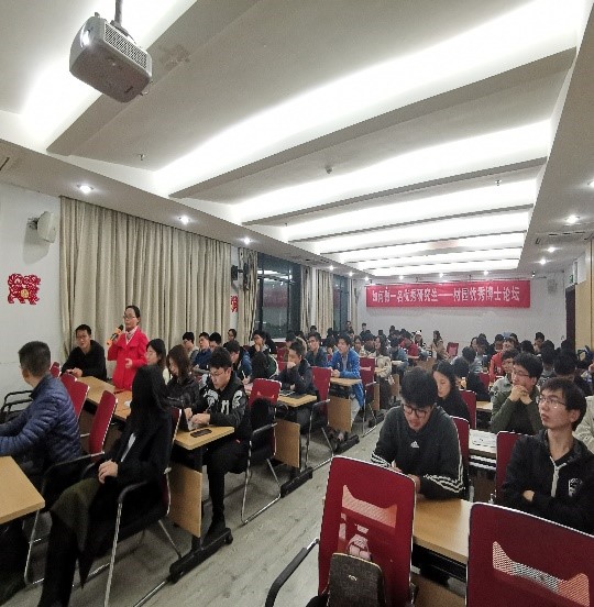 19点论坛正式开始,现场座无虚席。党委副书记蒋文海在开场致词中表达了对霍文龙博士的感谢,并重点向前来参加论坛的同学介绍了霍博士丰硕的学术成果,鼓励同学们善于向霍文龙等顶尖博士学习,公司将多邀请校内外优秀博士来公司讲课,多为研究生举办优秀博士论坛等活动。