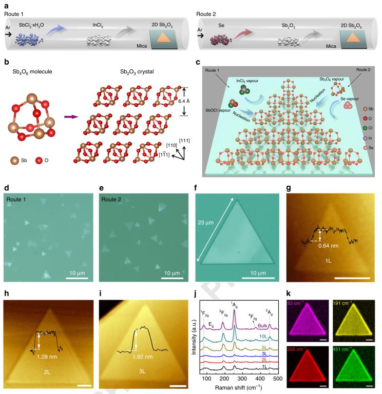图1、二维Sb2O3分子晶体的合成方法、晶体结构、生长机理、表面形貌以及拉曼光谱表征