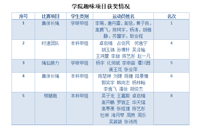 开幕式结束后,比赛项目正式开始。材料师生在各项比赛项目中展示风采。以下是公司师生在各项比赛项目中取得的成绩汇总:
