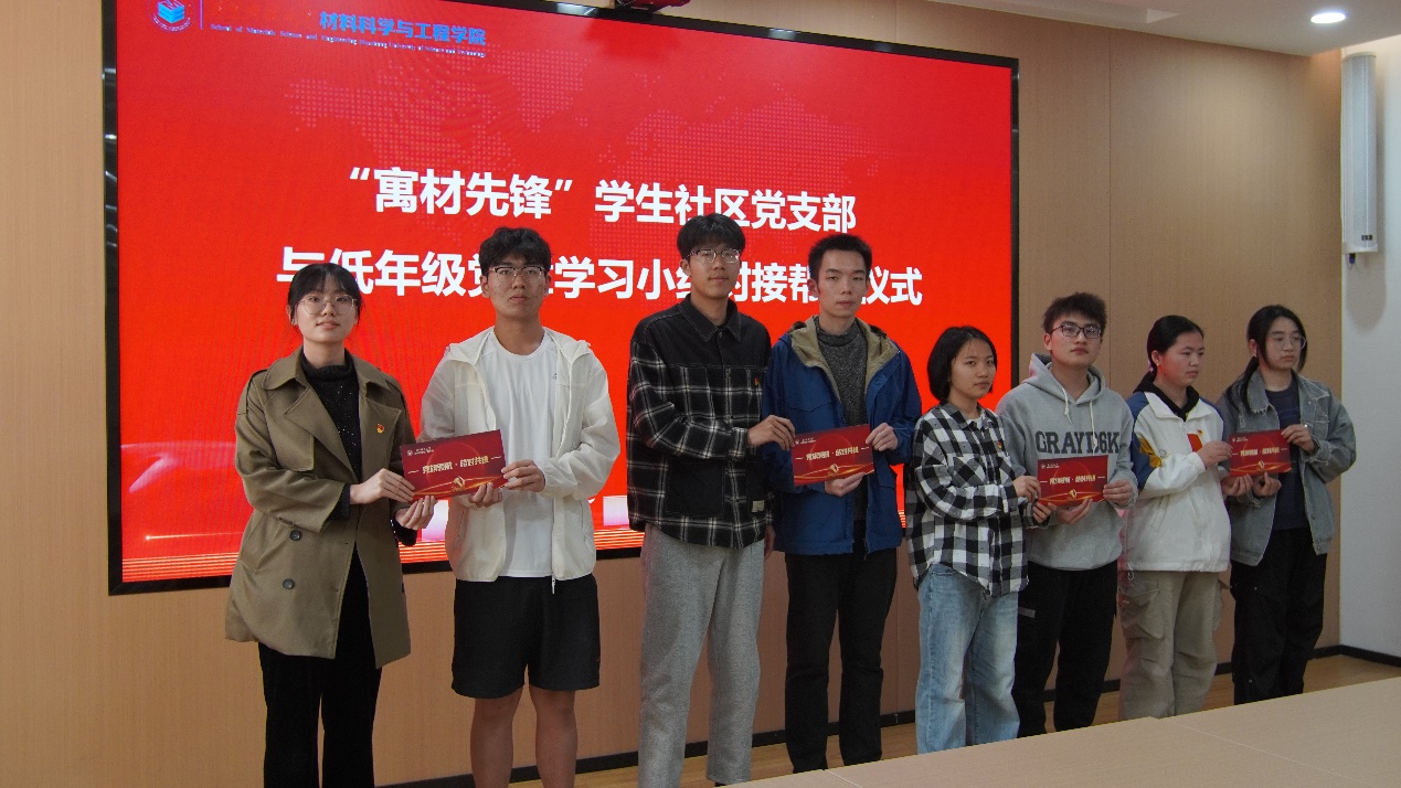为让“有问题找党员”真正实现,会议现场进行“寓材先锋”员工社区本科生党支部党员代表与低年级党章学习小组组长代表对接帮扶仪式。支部党员李佳音、孙龙伟、何诗语、孙晨分别向低年级党章学习小组组长周益白、刘元坤、何冬健、涂晨雨颁发“党旗领航·结对共进”卡片,支部党员将通过日常交流、党员进寝室、党员进班级等方式为同学们提供帮助。
