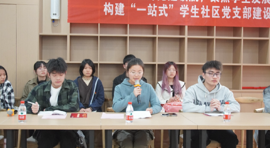 2024级党章学习小组组长龚霞同学发言。作为低年级代表,她谈到,同学们大多比较内向,很少主动寻求帮助,她通过分享高年级党员学长在学习上帮助自己的案例,感受到优秀党员对低年级同学的积极引导作用。她表示,社区党支部的“结对帮扶”行动搭建了高低年级互相学习、互相交流的渠道,能够让同学们在社区感受到党组织的温暖力量。