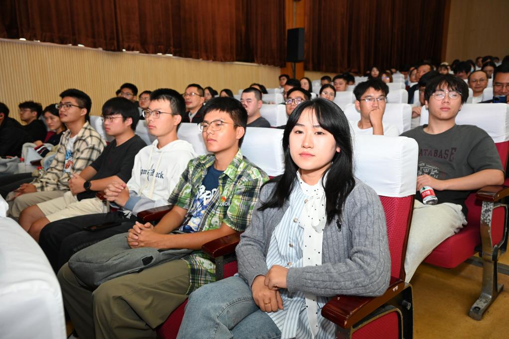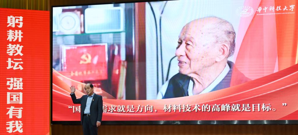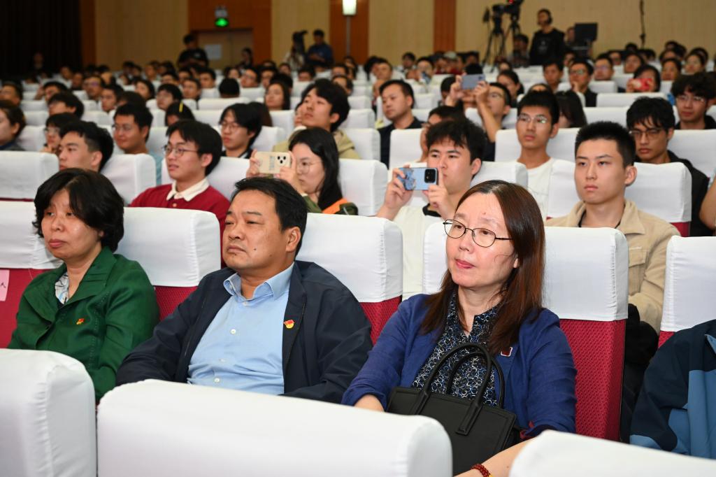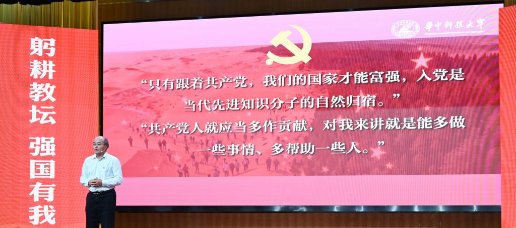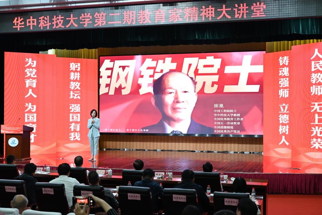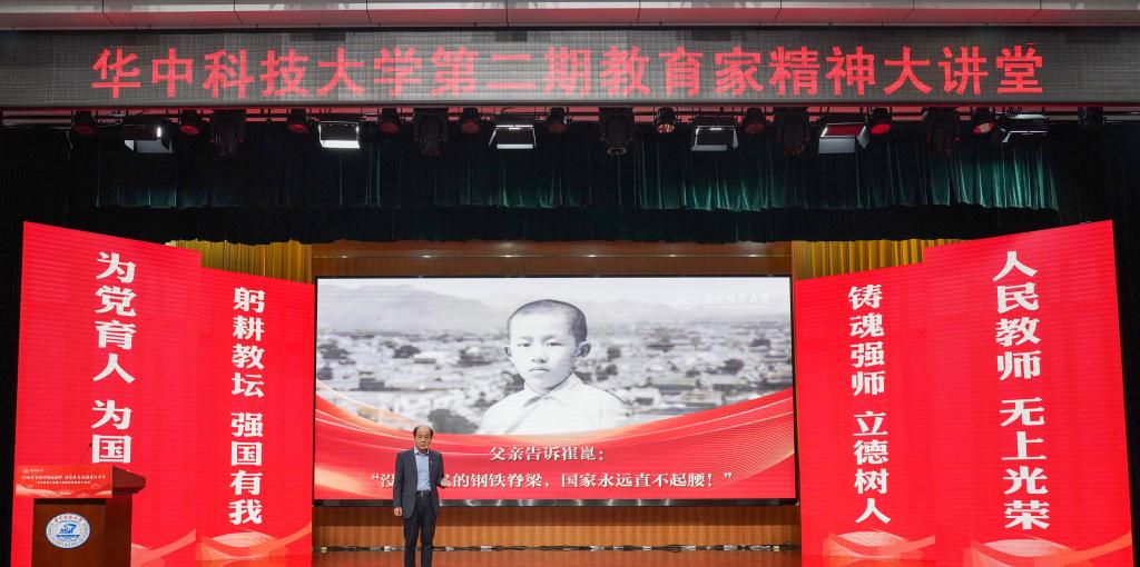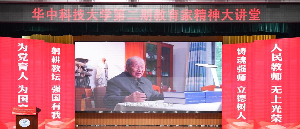 崔崑院士在寄语视频中表示,实干是华科大人一以贯之的优良传统,希望广大教师继续弘扬实干作风,始终胸怀“报国”之志、永葆“勤奋”之心,积极投身公司建设与发展事业,为推动社会进步贡献智慧与力量。现场观众认真聆听宣讲。