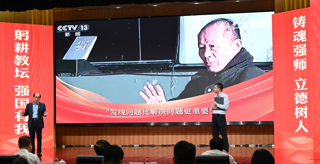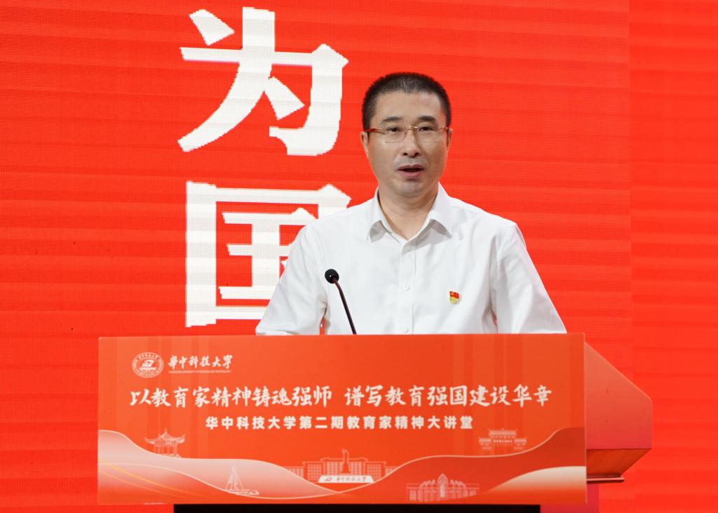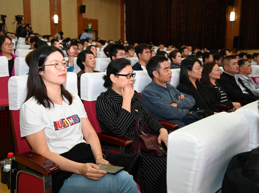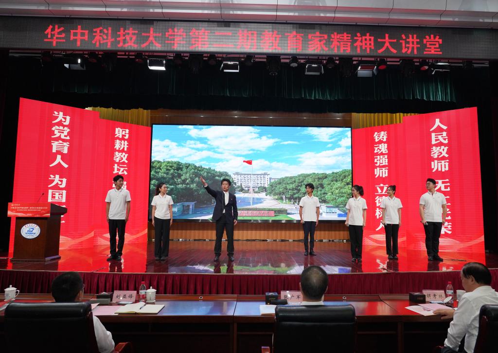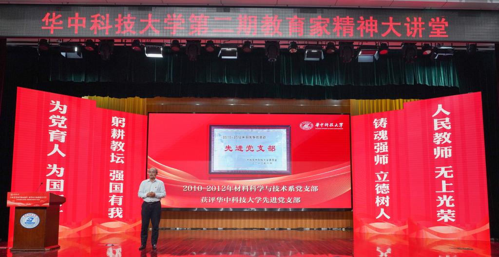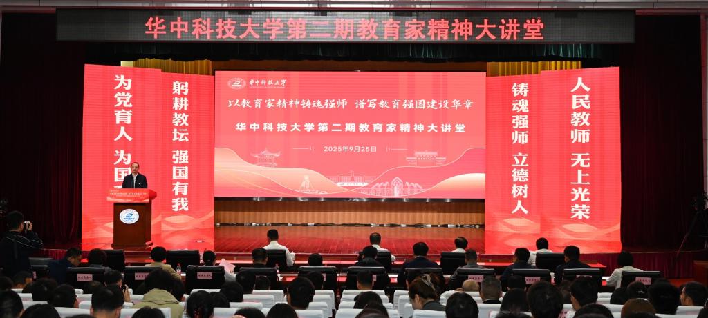 崔崑院士在寄语视频中表示,实干是华科大人一以贯之的优良传统,希望广大教师继续弘扬实干作风,始终胸怀“报国”之志、永葆“勤奋”之心,积极投身公司建设与发展事业,为推动社会进步贡献智慧与力量。现场观众认真聆听宣讲。