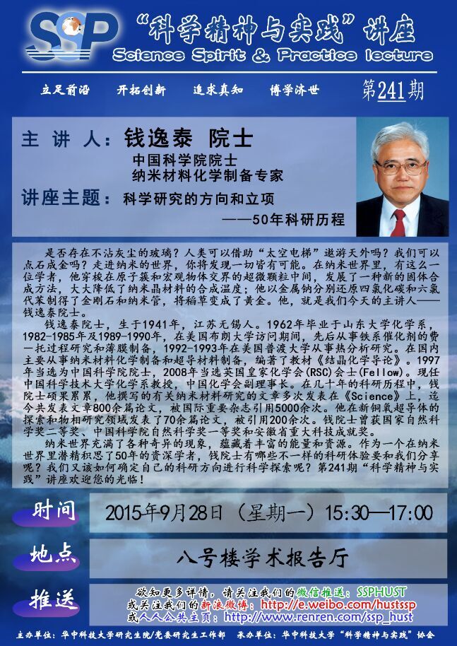 【9月28日下午】钱逸泰院士作“科学研究的方向和立项”的讲座