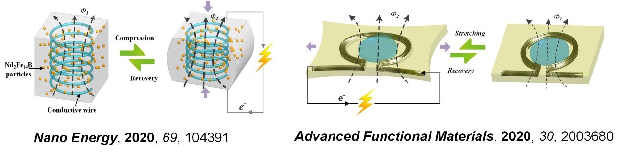 该课题组2019年提出柔性磁电材料的设计与制备,先后制备了压力型(图2左边)、拉伸型(图2右边)柔性电磁复合材料,实现了机械压力/拉力与电能之间的转换。