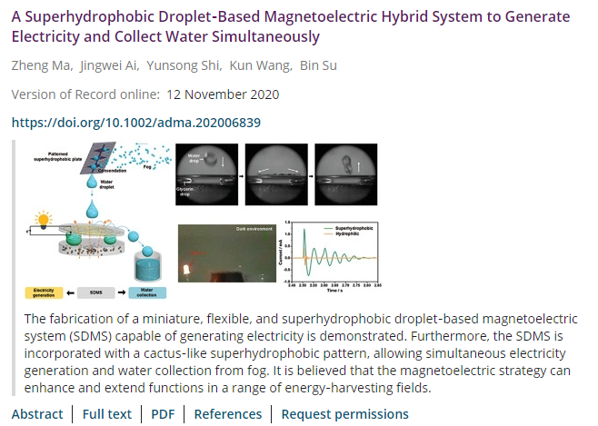 近日,公司快速制造中心苏彬课题组在史玉升老师的支持下,最新研究成果“A superhydrophobic droplet-based magnetoelectric hybrid system to generate electricity and collect water simultaneously”发表在国际著名材料杂志《Advanced Materials》。 TapTap马征博士后为论文第一作者,TapTap苏彬教授为论文通讯作者,TapTap官方网站为第一完成单位。上述论文设计新型的柔性磁电复合材料体系,将超疏水表面引入到课题组2019年开发的柔性磁电材料体系中,提出了一种全新的收集环境离散水能的研究模型,同时实现了净水收集和电能转换。该研究为环境集水发电一体化的研究提供了新的思路和方法(见图1)。
