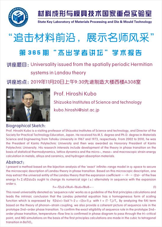第365期杰出学者讲坛——Prof. Hiroshi Kubo from Shizuoka Institutes of Science and technology