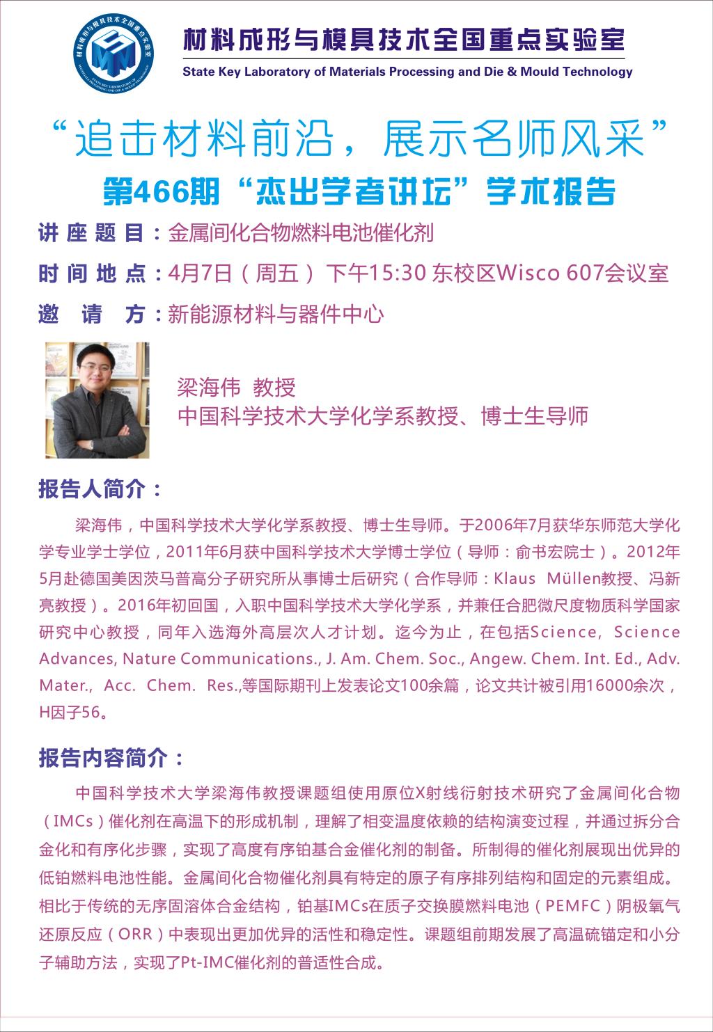2023年4月7日“杰出学者讲座”:金属间化合物燃料电池催化剂