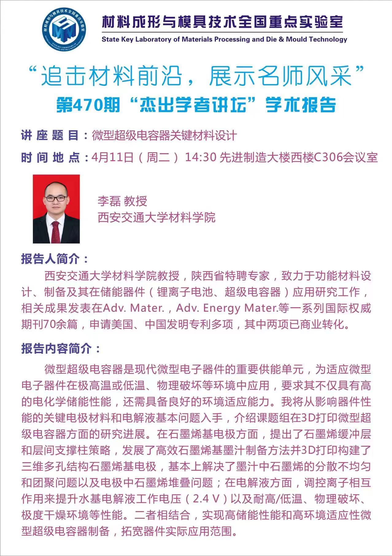 2023年4月11日“杰出学者讲坛”:微型超级电容器关键材料设计