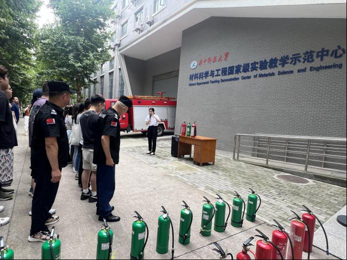 保卫处陈嘉璇科长逐一展示了各类火情对应灭火器,介绍了灭火器、消防栓和消防水带的使用方法,并讲解了火灾疏散和逃生的方法。