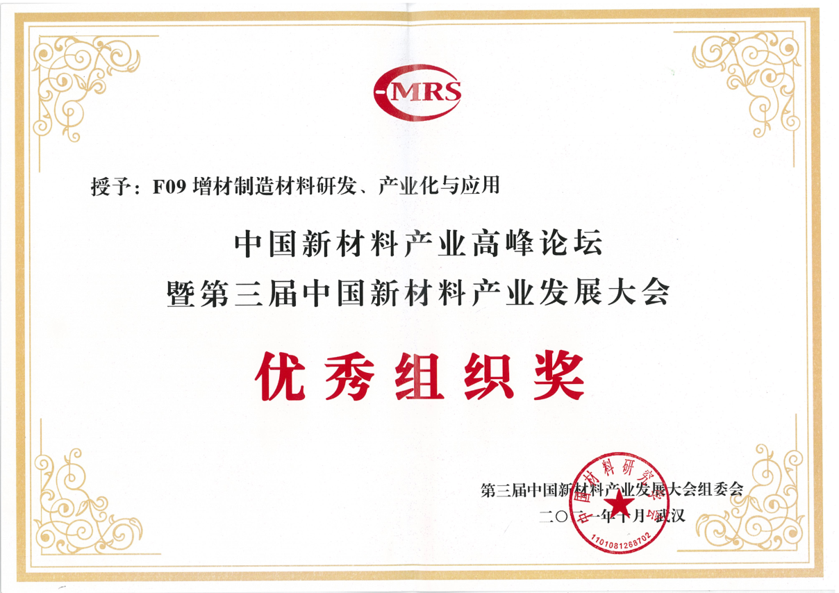 在论坛主席和联系人的精心组织和各位参会专家学者的共同努力以及四位志愿者(周文静、龙懿、张莘茹、向鸿澔)协助下,增材制造材料研发、产业化与应用分论坛最终取得了圆满的成功。本分会的工作也得到了中国材料研究学会的高度认可,获得了中国材料研究学会评为优秀组织奖。