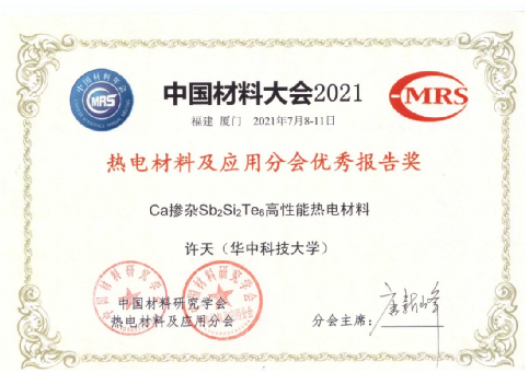 图2. 许天博士荣获热电材料及应用分会优秀报告奖