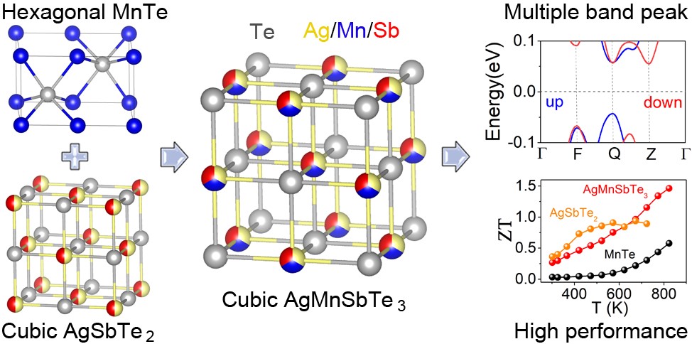 近日,TapTap官方网站杨君友教授(Junyou Yang)、罗裕波教授(Yubo Luo)与新加坡南洋理工大学颜清宇教授(Qingyu Yan)和美国西北大学Mercouri G. Kanatzidis教授研究团队合作,通过熵驱动实现了六方MnTe和立方AgSbTe2的化合,获得了立方结构的p型窄禁带AgMnSbTe3新型半导体热电材料。AgMnSbTe3具有岩盐矿NaCl晶体结构(其中 Ag、Mn、Sb共同占据Na节点位置)和多价带顶能带结构。该化合物具有优异的热电性能,热电优值ZT在823 K时为1.46,在400~773 K宽温域平均ZT值达0.87。该工作通过高熵设计合成了AgMnSbTe3新型化合物半导体热电材料,为热电材料的研究和开发提供了一种新思路,于近期发表在Journal of the American Chemical Society上。