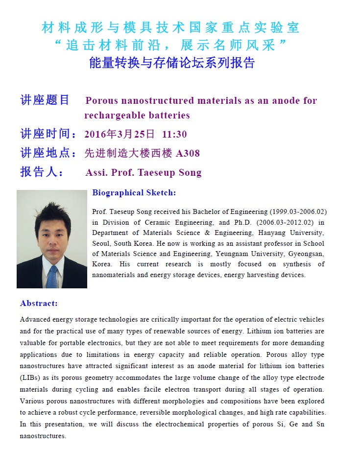 3月25日9:00-17:30在材料新大楼A308举行能量转换与存储系列讲座,届时将有韩国汉阳大学Ungyu Paik教授,新加坡NTU David Lou教授和Xin Wang教授,武汉大学汪的华教授等…