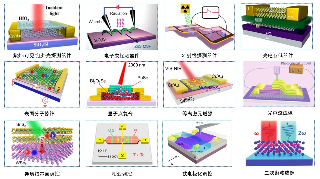 1、光电二维晶体材料与微纳器件: 开发先进的二维材料制备技术,致力于实现若干高质量二维原子晶体及其异质结的可控合成;进行二维无机分子晶体前沿探索,实现二维无机分子晶体的制备,拓展二维分子晶体在电子、光电以及相变器件的应用;开展基于二维金属硫属化合物及其异质结构的晶圆级生长、微纳成形及器件加工技术研究;发展先进的二维异质结构图案化和阵列化的纳米制造手段,对其与微纳电子器件的有效融合进行深入的研究,推进二维材料在工业晶圆级集成器件中的应用进程;开发基于二维晶态材料的微纳型光电探测器件和光电存储器件,推进二维光电探测器在工业自动控制、光度计量等国民经济工业自动控制、光度计量等国民经济领域的潜在应用;研究量子纳米材料的设计体验及制备技术;开发高质量外尔半金属薄膜、二维拓扑绝缘体等量子材料与物理方面研究;开展新型二维功能材料的理论计算设计研究,通过高通量计算来寻找潜在的二维功能材料。