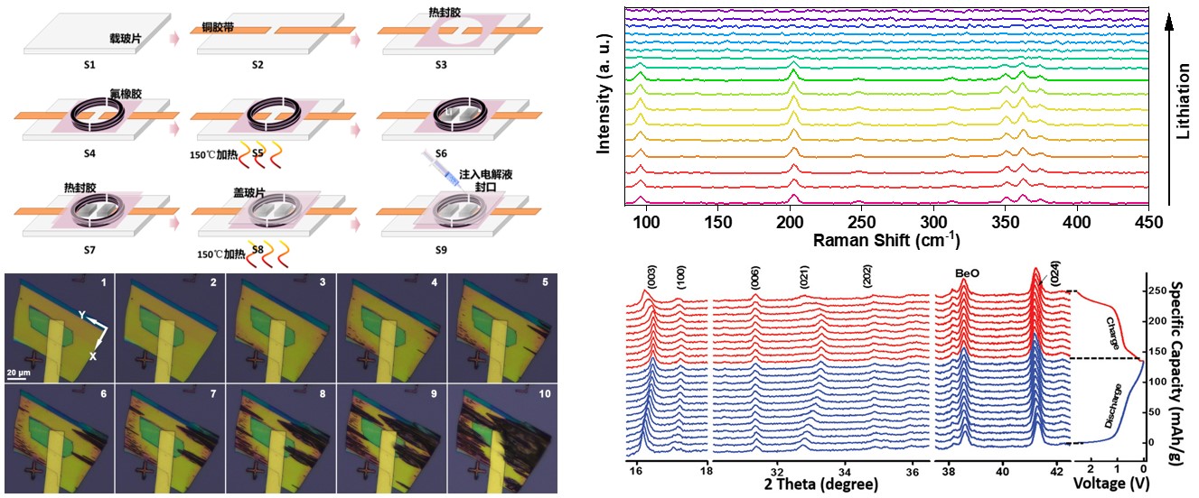 2、储能材料与原位器件:面向国家战略需求,在开发新型高能量密度二次电池电极材料方面进行基础研究和技术开发,在器件微纳化、多方法、多尺度原位观测方面形成了特色与优势。具体工作包括:开发具有新相结构、高比容量的锂/钠离子电池电极材料;开发基于锂负极的固态电池及其相关技术;发展多种构型的柔性储能器件以及可拉伸、可弯曲、异型化的器件构筑工艺;利用半导体微纳加工技术构筑微型液体电池,实现对活性材料单片、单根、单晶、单颗粒层次的原位光学观察,结合在线XRDRamanAFM等技术实现对电极充放电过程结构演变的原位监测;搭建SEM多探针测试系统,集成电场、温度场、力场等多位条件下对电池失效机制的同步、实时、微区研究;研究新型二次电池等能源储存纳米器件、钙钛矿太阳能电池、光/电催化等新能源材料应用技术。
